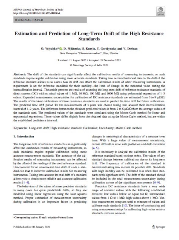 У січні 2026 р. у журналі «MAPAN» (квантиль Q2 у Scopus), який видається у Індії, опублікована стаття «Оцінка та прогнозування довгострокового дрейфу мір великого опору» (Estimation and Prediction of Long-Term Drift of the High Resistance Standards) авторів Олега ВЕЛИЧКА, Дениса НІКІТЕНКА, Сергія КУРСІНА, Тетяни ГОРДІЄНКО і Василя ДОВГАНЯ. Журнал MAPAN присвячений виключно метрології (науковій, промисловій чи юридичній). Він публікує дослідницькі повідомлення або технічні статті, що становлять актуальний інтерес у галузі вимірювальної науки; оригінальні роботи, навчальні посібники або оглядові статті з будь-якої галузі, пов’язаної з метрологією; огляди та аналітичні дослідження з метрології; тематичні дослідження надійності та невизначеності вимірювань; а також звіти та результати порівняльних та кваліфікаційних випробувань.